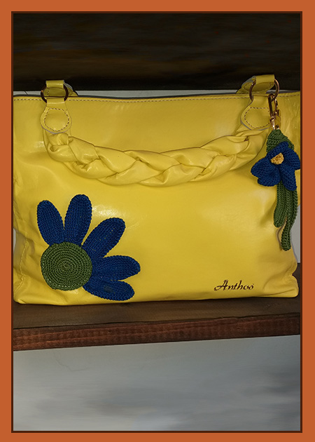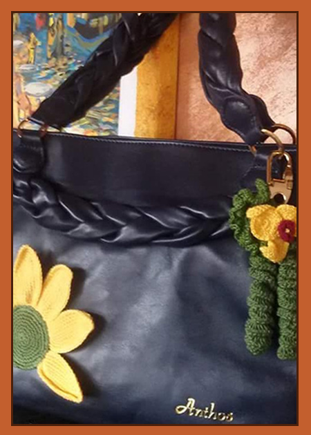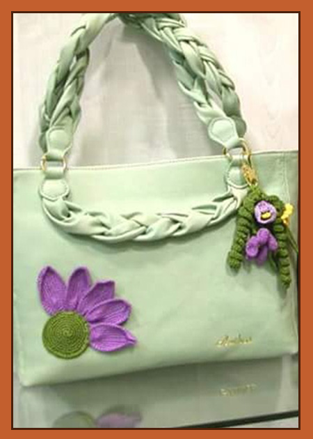Borsa in vera pelle con motivo floreale a crochet. Foderata con tasca e cerniera.
