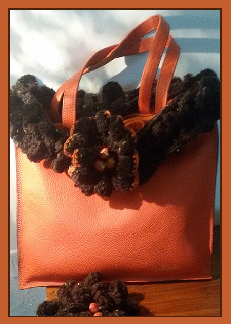 Borsa in pelle arancione e lana. Fiore in cotone, anche lavorazione a crochet. Riproducibili in colori e motivi a crochet diversi, con fiore stessa forma e misura e con manico a tracolla.