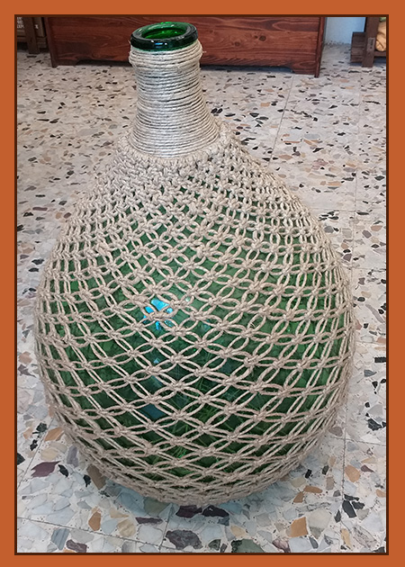 Una damigiana in vetro rivestita con la tecnica del macramè, in corda grossa.