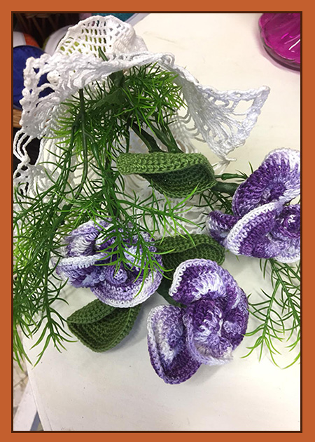 Composizione bouquet di rose a crochet con abbellimento.