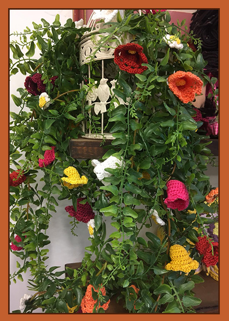 Grande composizione a crochet e abbellimento "gabbia uccelli" con decorazioni a uncinetto e piante.