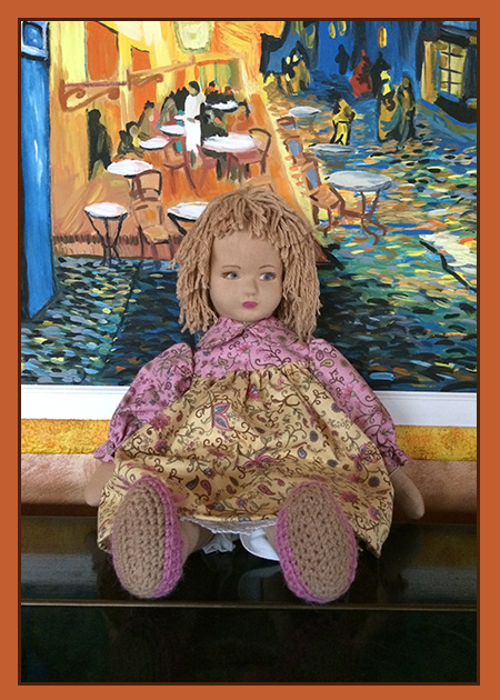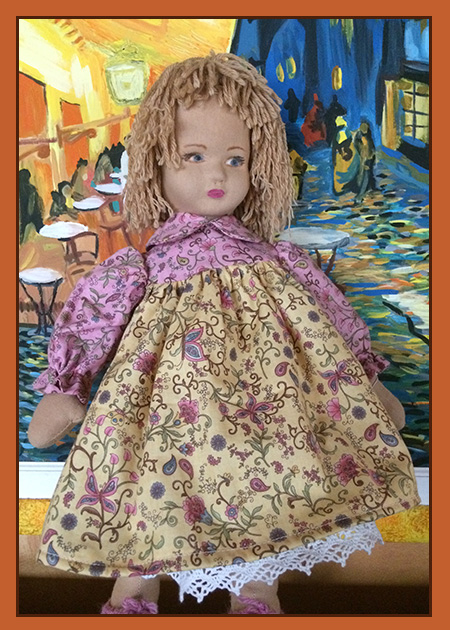 Bambole interamente realizzate a mano in ogni particolare. Corpo in maglina tessuto e imbottitura, viso con mascherina rivestita in maglina e dipinto a mano. Capelli in lana e vestito in cotonina con sottoveste e mutandoni bianchi.
